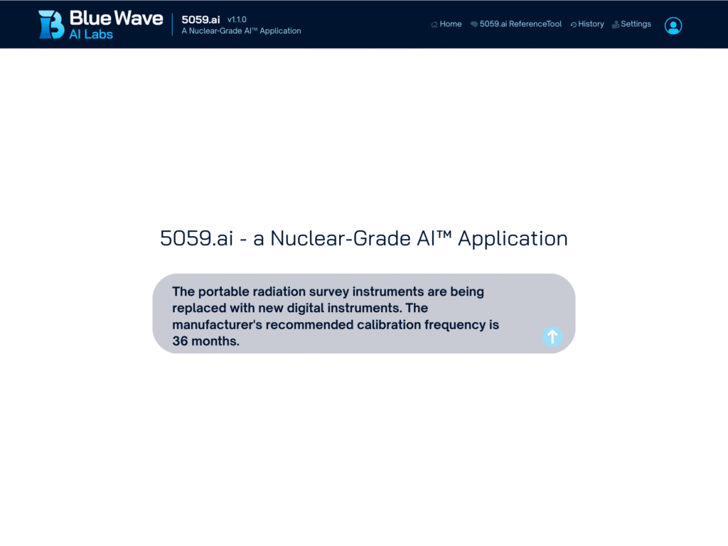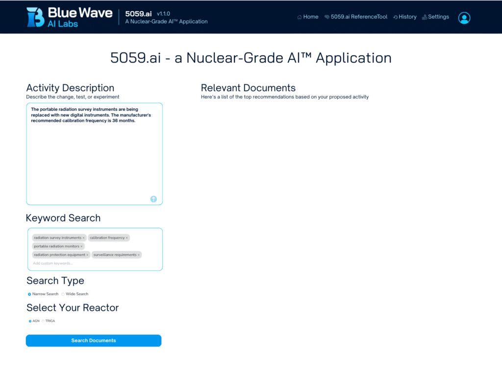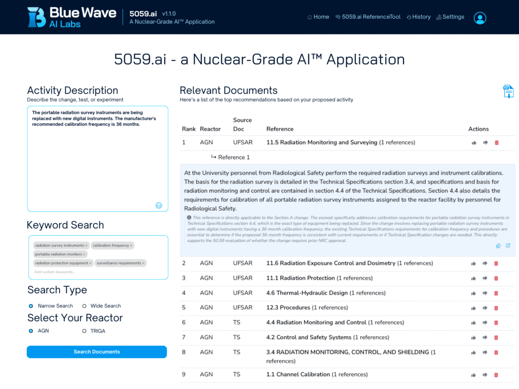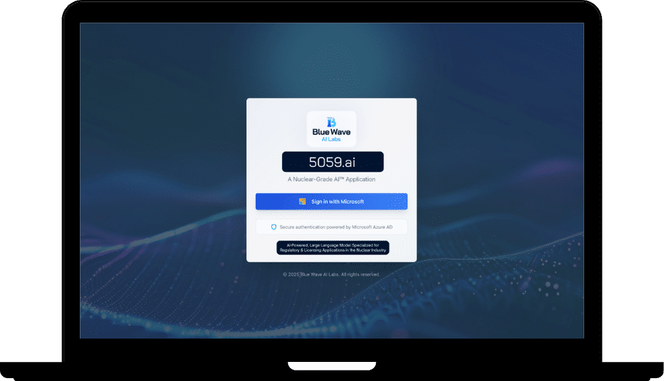 Blue Wave’s 5059.ai is a NEW Nuclear-Grade AI™ Application that removes TIME, COST, and COMPLEXITY from your 50.59 Screening Process by automating your entire reference search. Trusted technology that dramatically cuts search time via AI-driven keyword generation and document analysis. Instantly identify every relevant reference you need for informed & accurate screenings. Initiate your 10 CFR 50.59 screenings with 5059.ai at the intersection of Complete Confidence, Complete Search, and Complete Decisions.